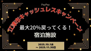 PayPay 【PayPayペイペイ】江津市20%還元キャンペーン宿泊施設対象店舗!島根県最新情報 今回は、島根県江津市20%還元対象の、 宿・ホテル・旅館等のをご紹介します。 期間は、2025年10月1日 午前0時 ~ 2025年11月30日 午後11時59分まで。 楽天トラベル 【じゃらん】国内24000軒の宿をネ... 2025.10.06 PayPay